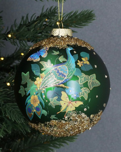 Matt Emerald Green/Sequin Peacock Glass Bauble
