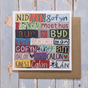 The words of Welsh favourite song ‘Calon Lan’ in colourful fonts. The words describe that ‘I Don’t Want All The Riches Of The World, All I Want Is A Happy Heart, An Honest Heart, A Pure Heart’