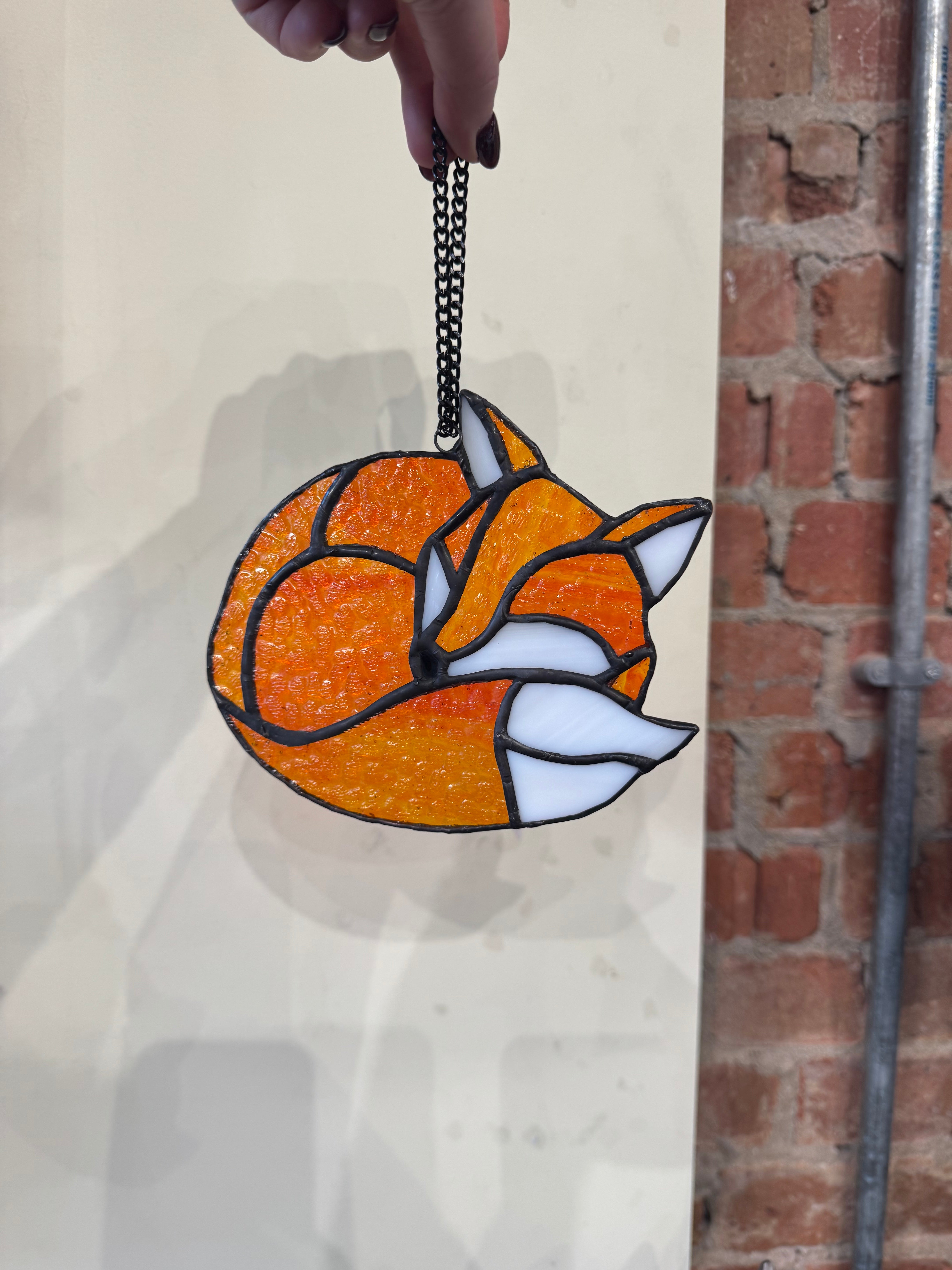 Sleeping Fox Hanging Stained Glass, a light-catching original leaded and sealed hanging panel by a self-taught artist hailing from Waunarlwydd. This artist discovered her talents through crafting at her home studio! Complete with a chain for hanging.