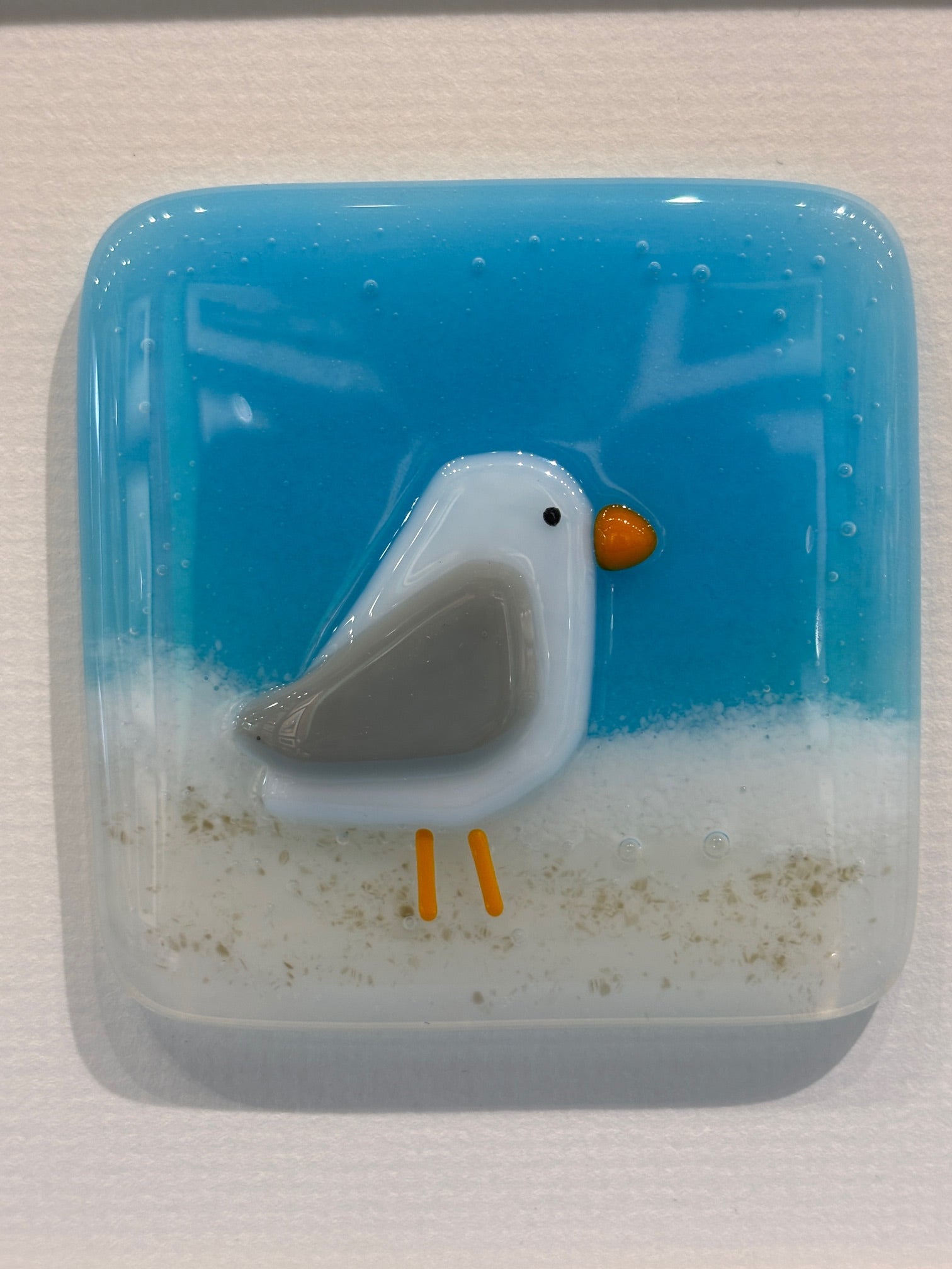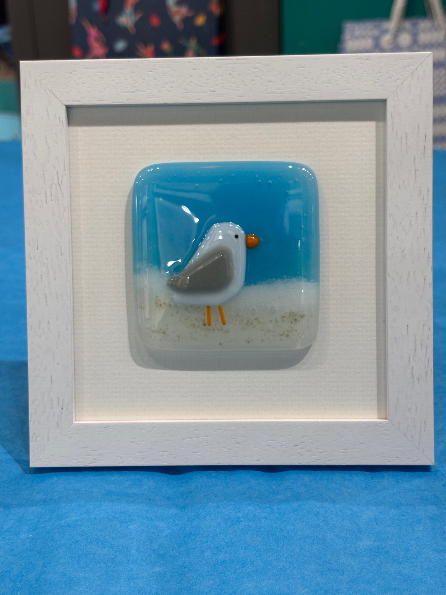 This cheeky seagull is individually created from fused glass. Each seagull is set against a glass-fused sky and beach. Fired twice at over 800 °c every piece is a little work of art in itself! Mounted directly onto the quality textured mount board and neatly and professionally framed with a high-quality finish. Hang on the wall or lean on a shelf