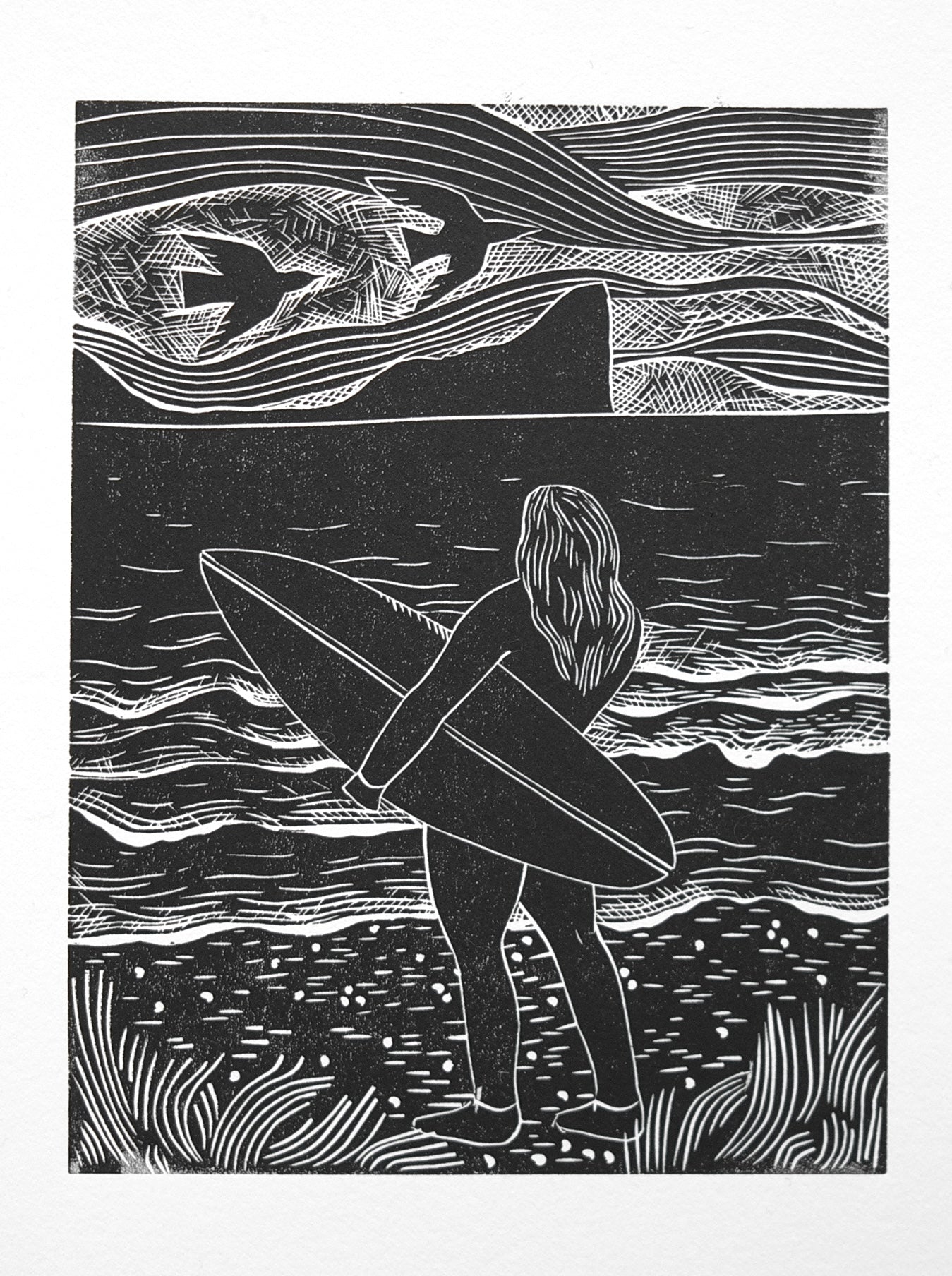 Worms Head from Llangennith Mounted Linocut Print For Sale on Behalf of Phillippa Walter