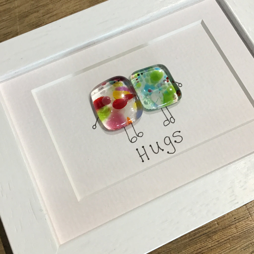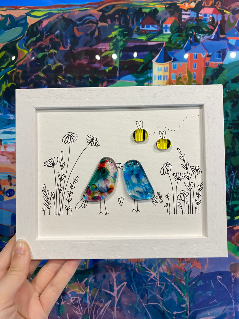 Medium Birds Two Fused Glass Birds and a Bee/Bees Framed 17x21cm for sale on behalf of the artist