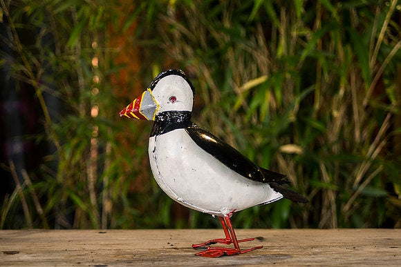 Hand made from reclaimed metals in Africa and then coated in a lacquer finish they can be left outside all year. Use a clear spray lacquer to maintain the finish as and when required.