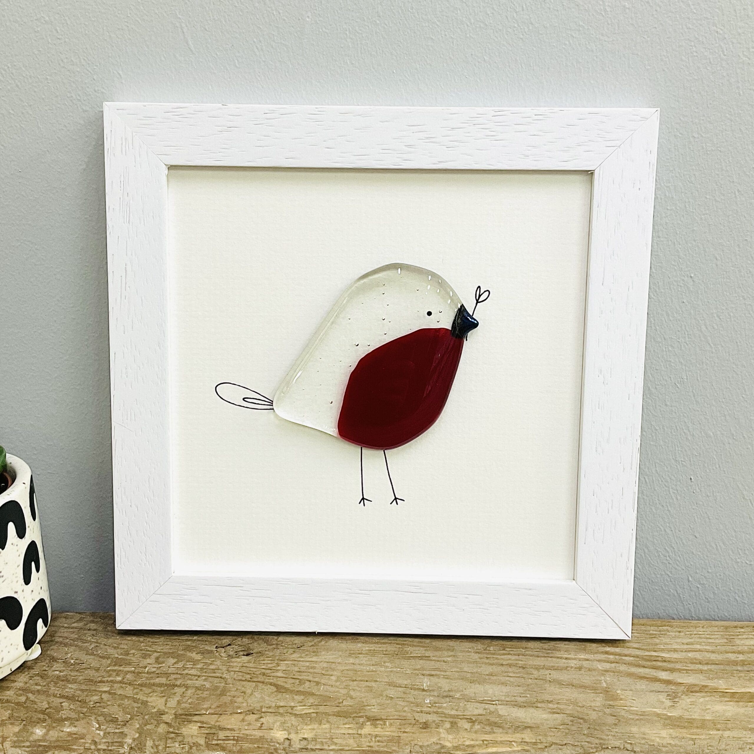 This glass robin has been fired and mounted in a professionally made wooden frame. The fused glass is mounted directly into the backing mount board. It can be hung on the wall or displayed on a shelf.