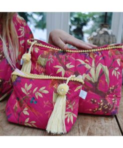 This generously sized wash bag has a silky lining, a zipped internal pocket, and decorative piping. The zip pulls with a pom-pom and pearl trimmed tassel and there is a turquoise pom-pom trim along the top. Gorgeous on-trend botanical print of lush foliage – overlapping leaves in shades of green are highlighted with touches of turquoise and set against a white background.