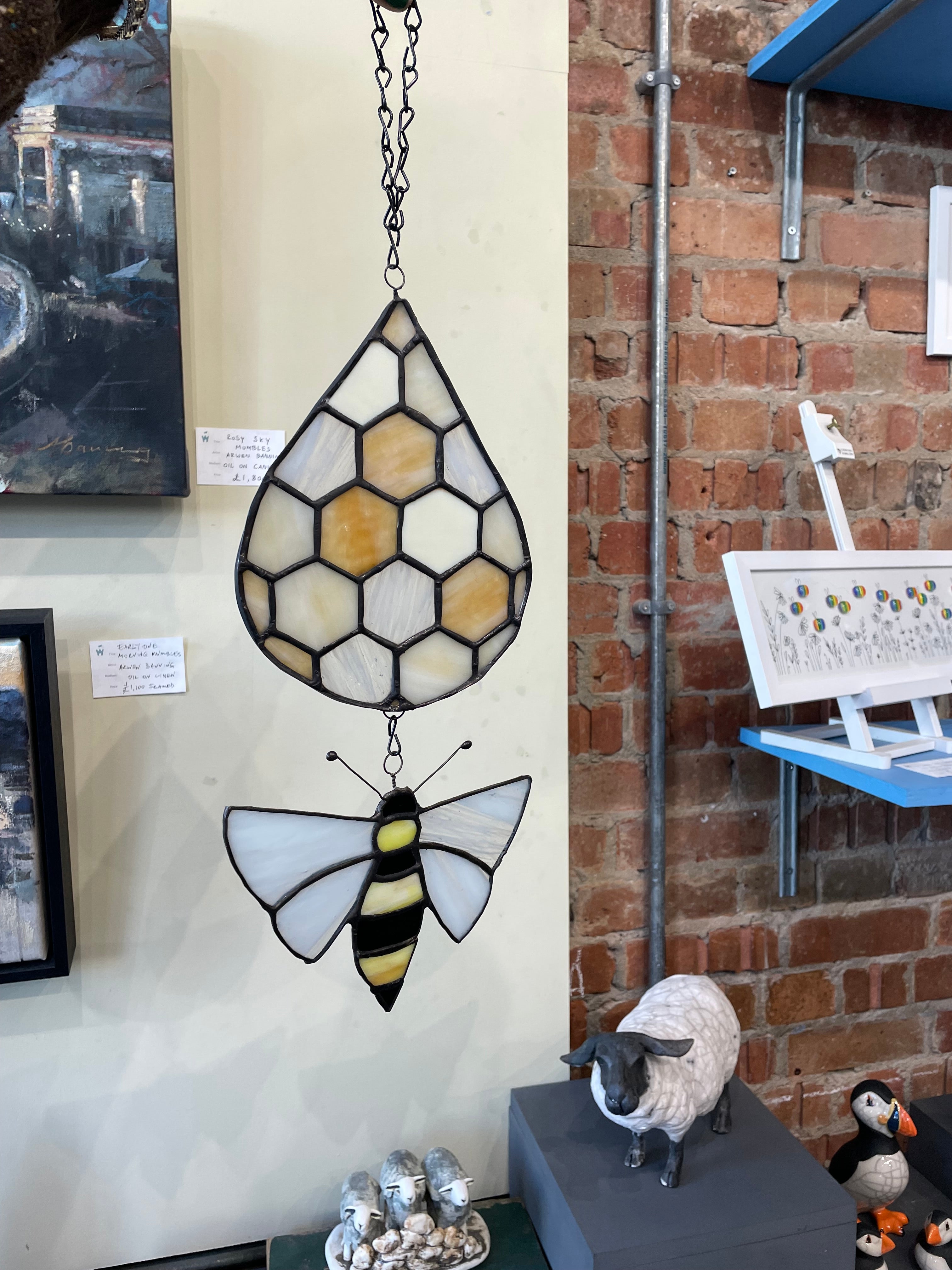 Bee and Honey Comb Hanging Stained Glass, a light-catching original leaded and sealed hanging panel by a self-taught artist hailing from Waunarlwydd. This artist discovered her talents through crafting at her home studio! Complete with a chain for hanging.