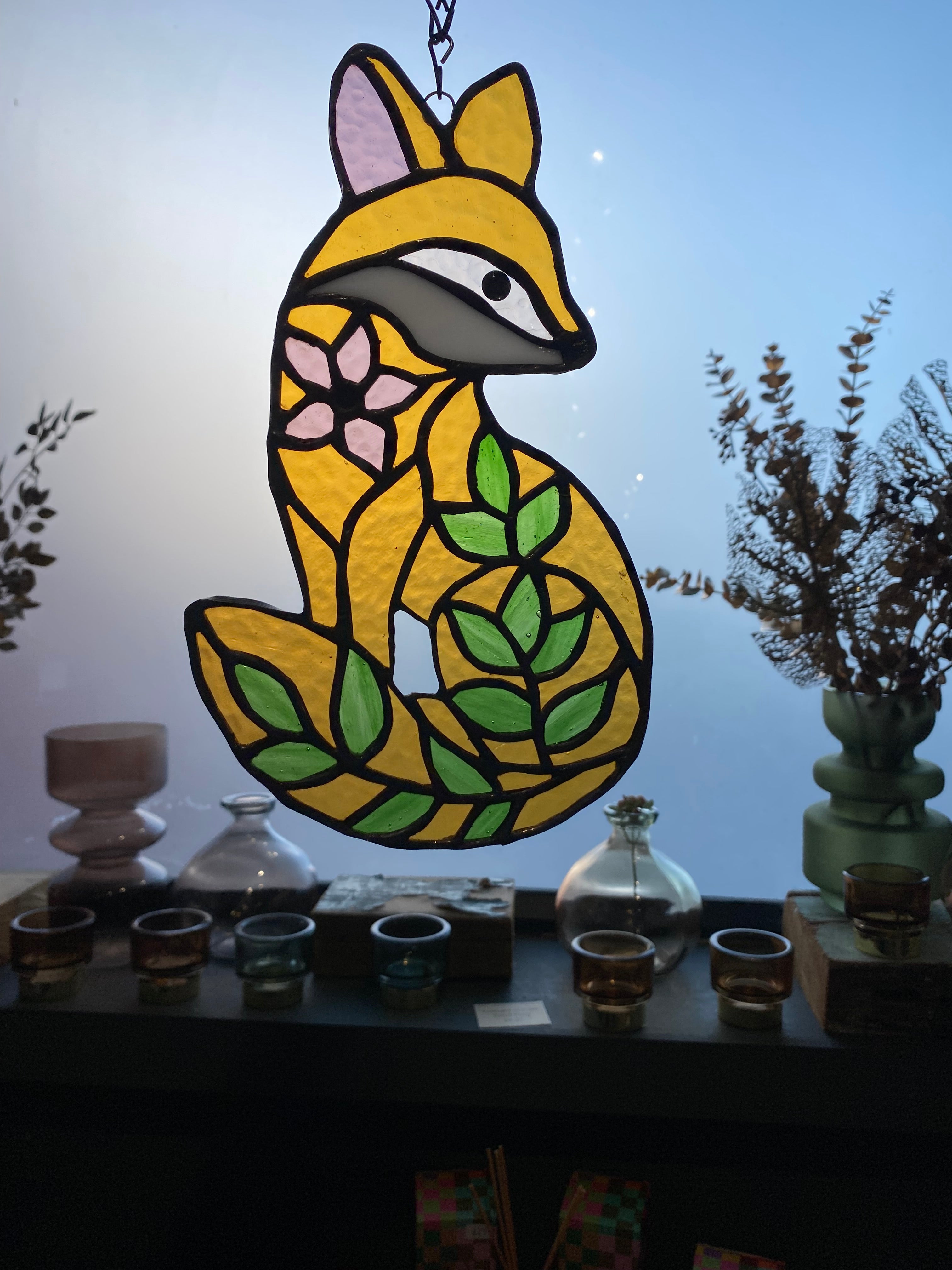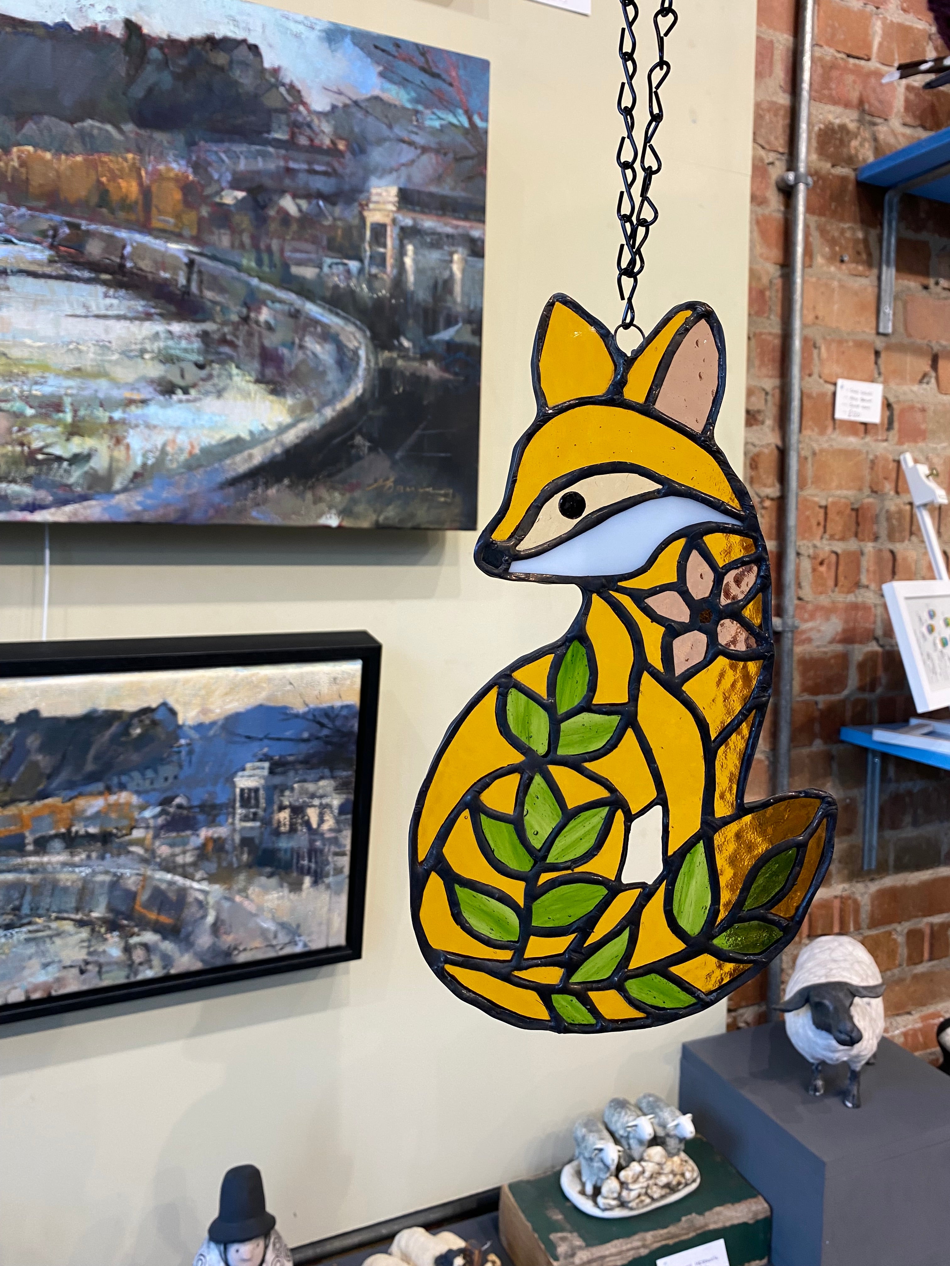 Fox and Flora Hanging Stained Glass, a light-catching original leaded and sealed hanging panel by a self-taught artist hailing from Waunarlwydd. This artist discovered her talents through crafting at her home studio! Complete with a chain for hanging.