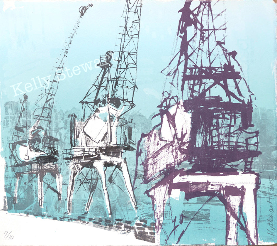 Cranes At Leith Docks Screen Print for sale on Behalf of Kelly Stewart Usually ships within 24 hours.