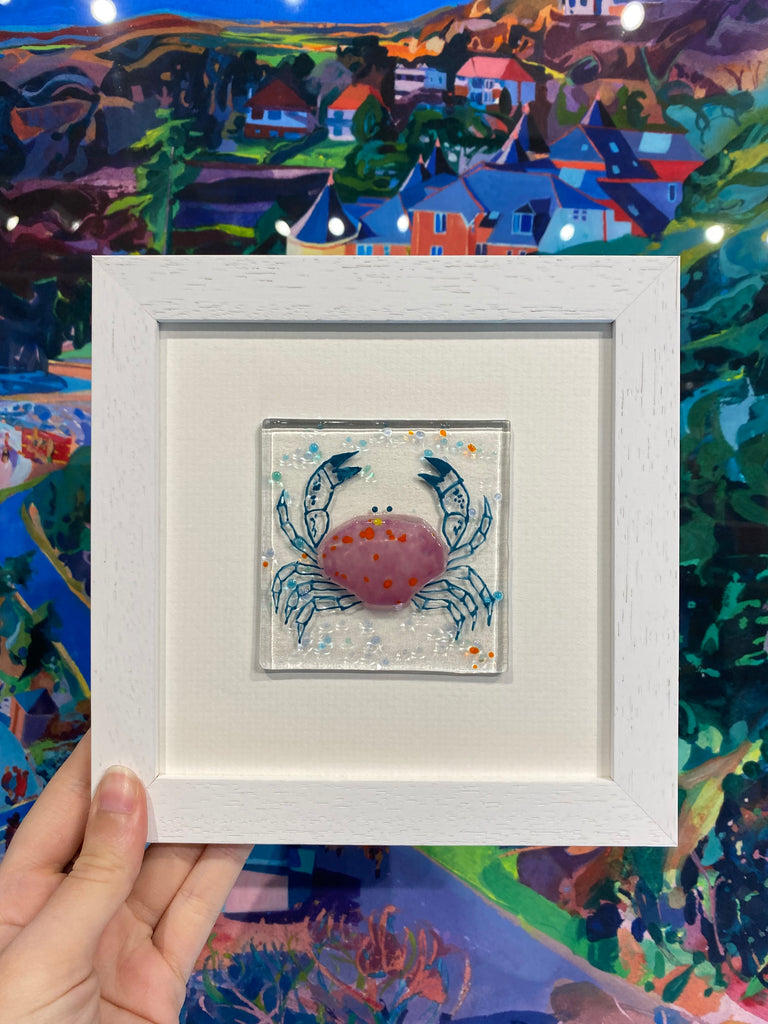 This glass crab has been fired and mounted in a professionally made wooden frame. The fused glass is mounted directly into the backing mount board. It can be hung on the wall or displayedon a shelf.