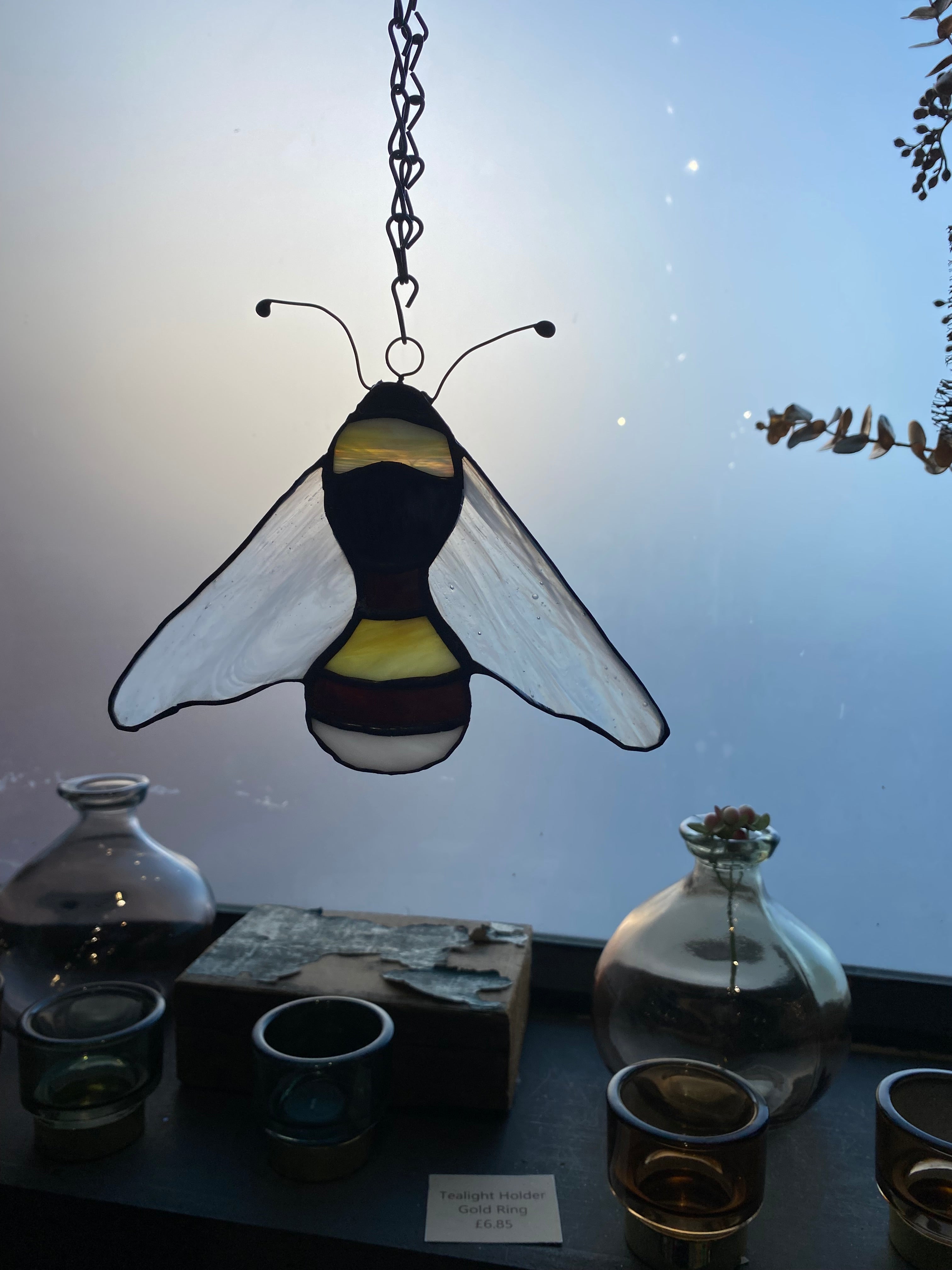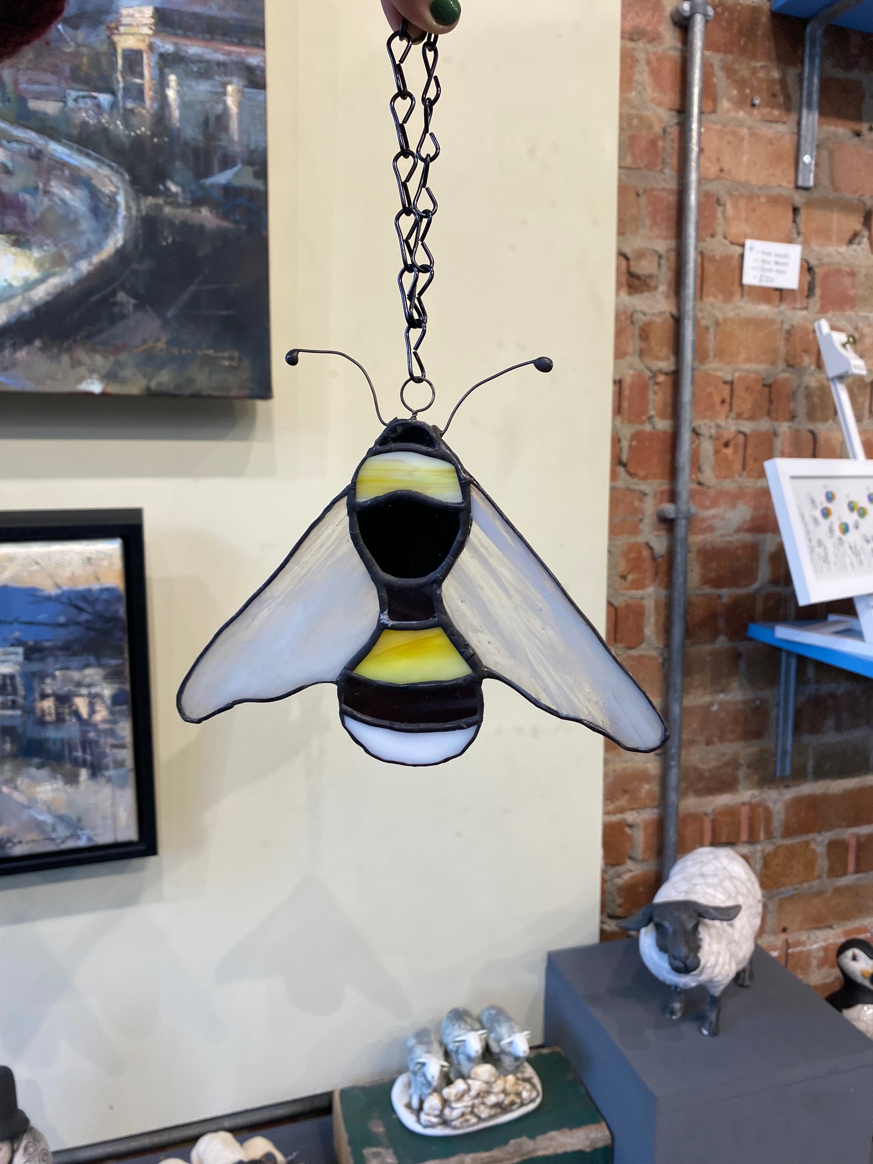 Bumblebee Hanging Stained Glass, a light-catching original leaded and sealed hanging panel by a self-taught artist hailing from Waunarlwydd. This artist discovered her talents through crafting at her home studio! Complete with a chain for hanging.