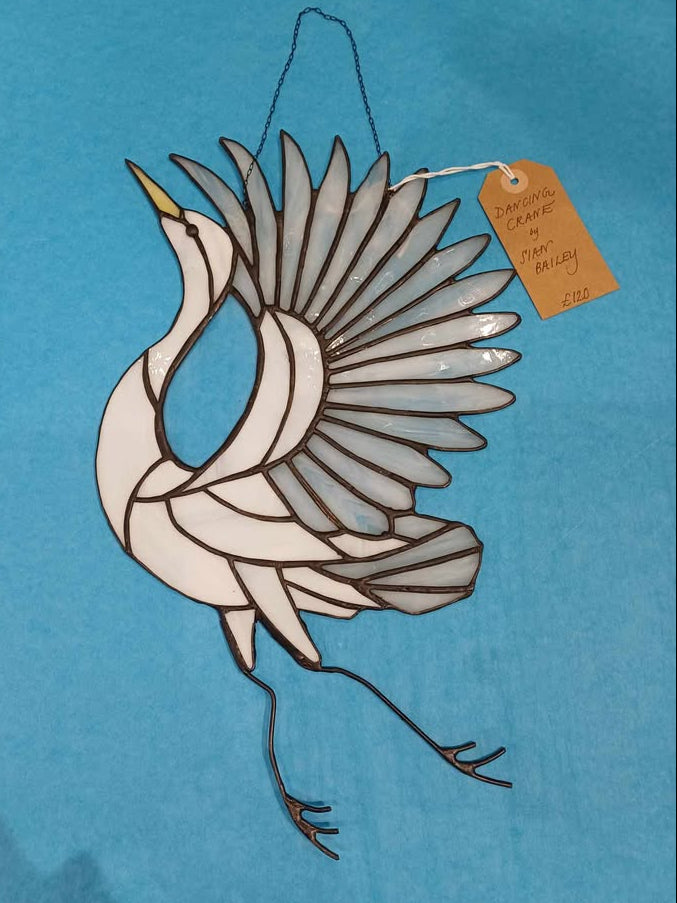 Magnificent Dancing White Crane, a light-catching original leaded and sealed hanging panel by a self-taught artist hailing from Waunarlwydd. This artist discovered her talents through crafting at her home studio! Complete with a chain for hanging.