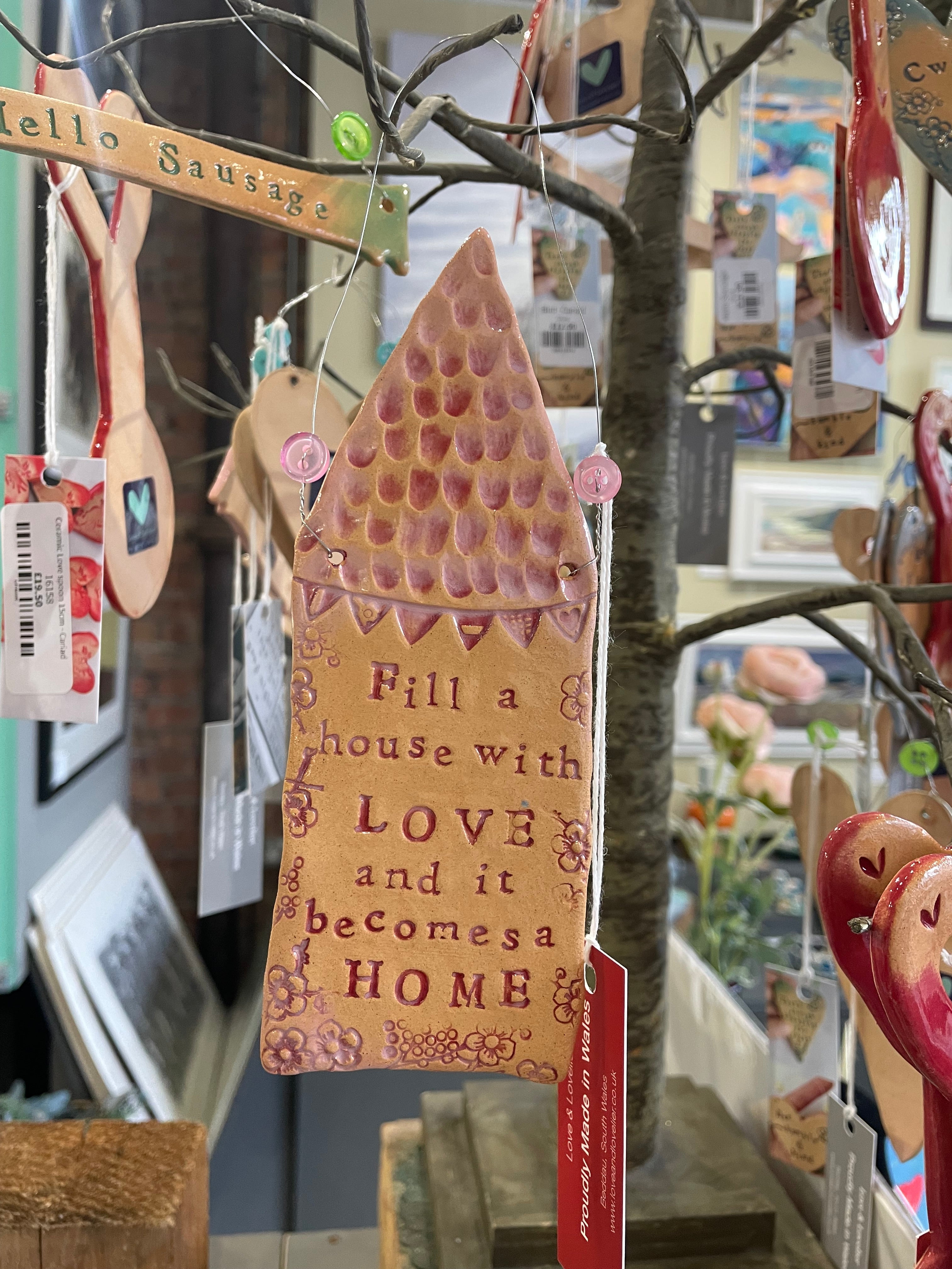 This a cute ceramic house-shaped plaque strung with wire and vintage buttons for you to hang on the wall. It has the words: 'Fill House with Love and it becomes a Home' imprinted into the clay.