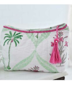 There’s a nod to the 1950s with this vintage-inspired wash bag. The tropical print has fronds of pale green leaves framing palm trees and exotic flowers against the white background. The bag is embellished with a bright pink pom-pom trim and a pearl-trimmed tassel on the zip pull is the finishing touch!