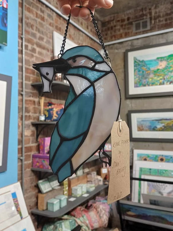 King Fisher with Single Fish Hanging Stained Glass, a light-catching original leaded and sealed hanging panel by a self-taught artist hailing from Waunarlwydd. This artist discovered her talents through crafting at her home studio! Complete with a chain for hanging.
