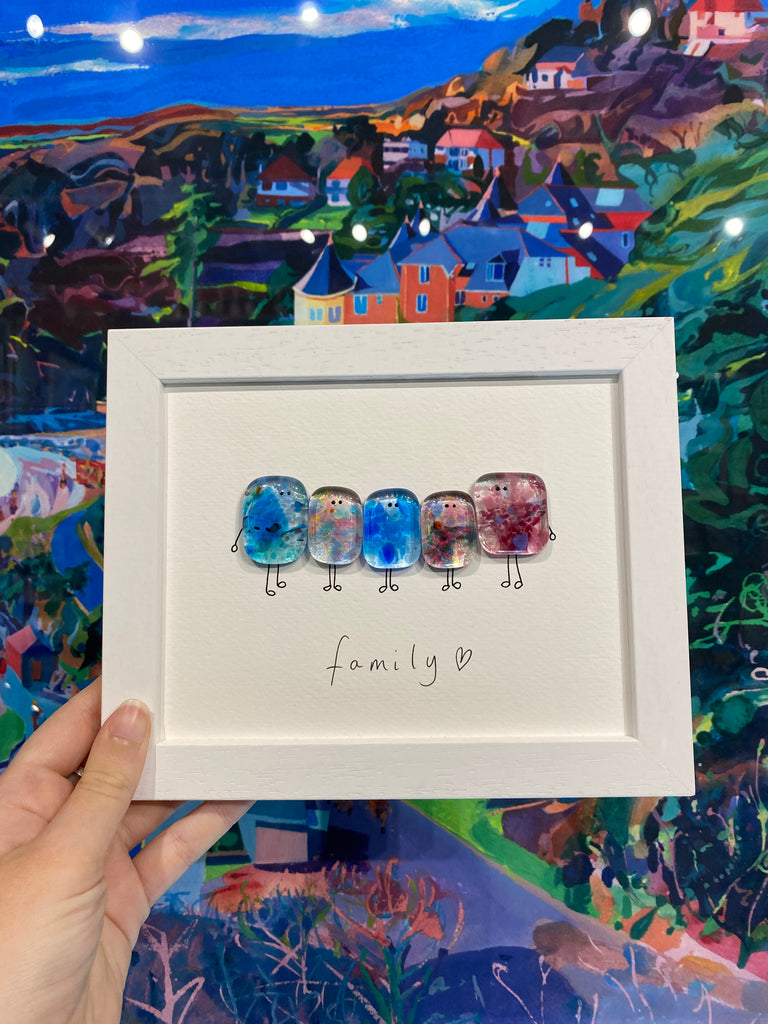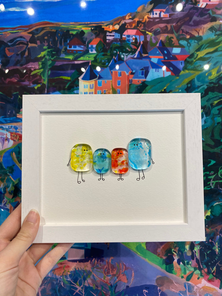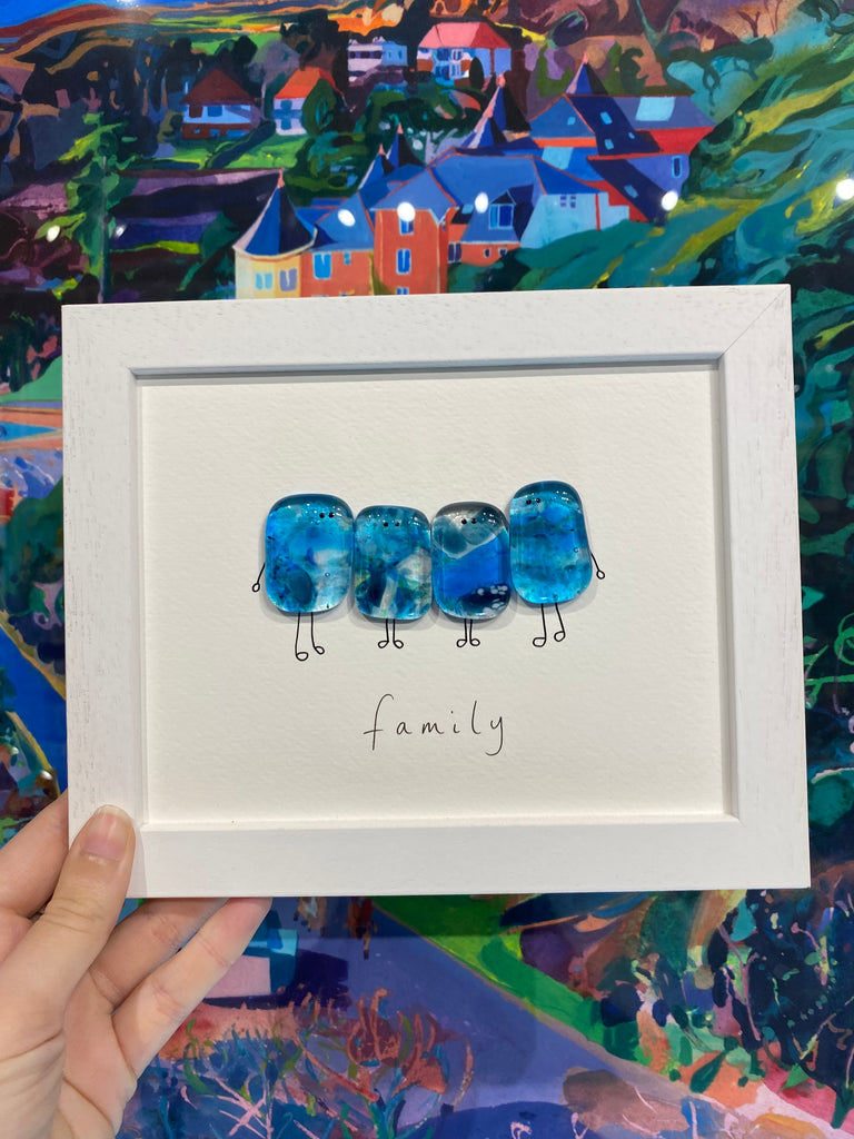 Fused glass people in a variety of colours, a charming piece made from hand fused glass. Available in a white and grey frame. Fused glass nuggets illustrated and mounted directly onto mount board.