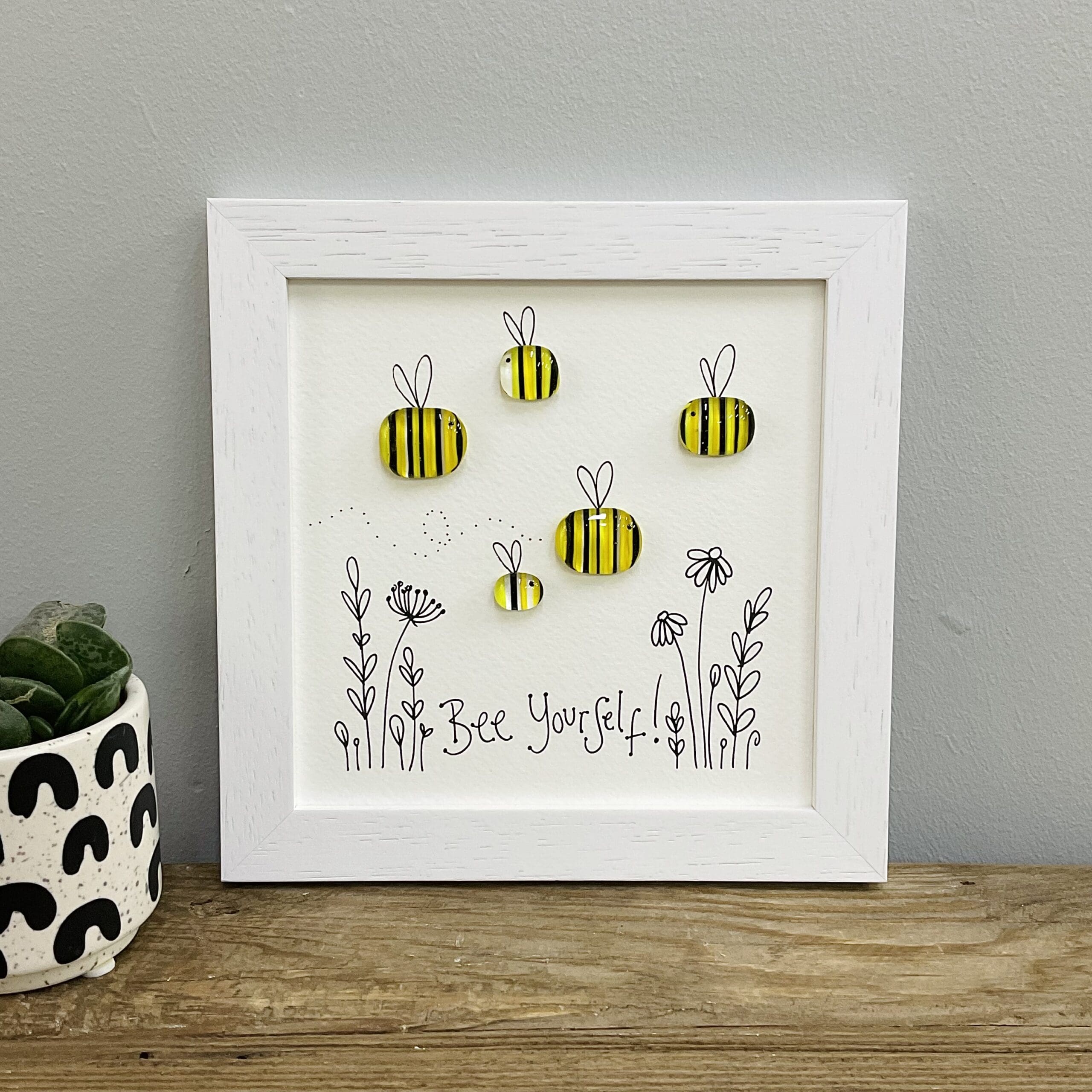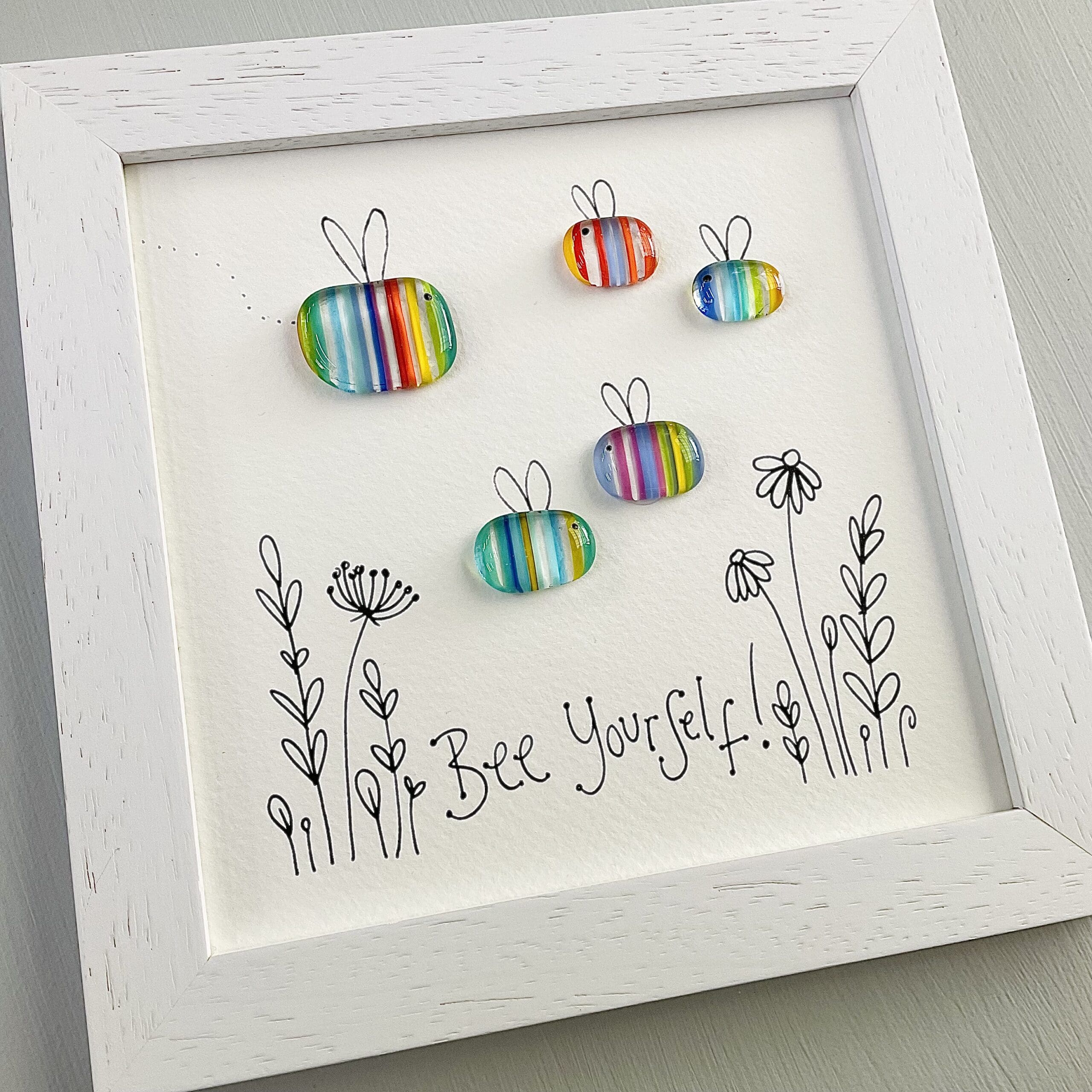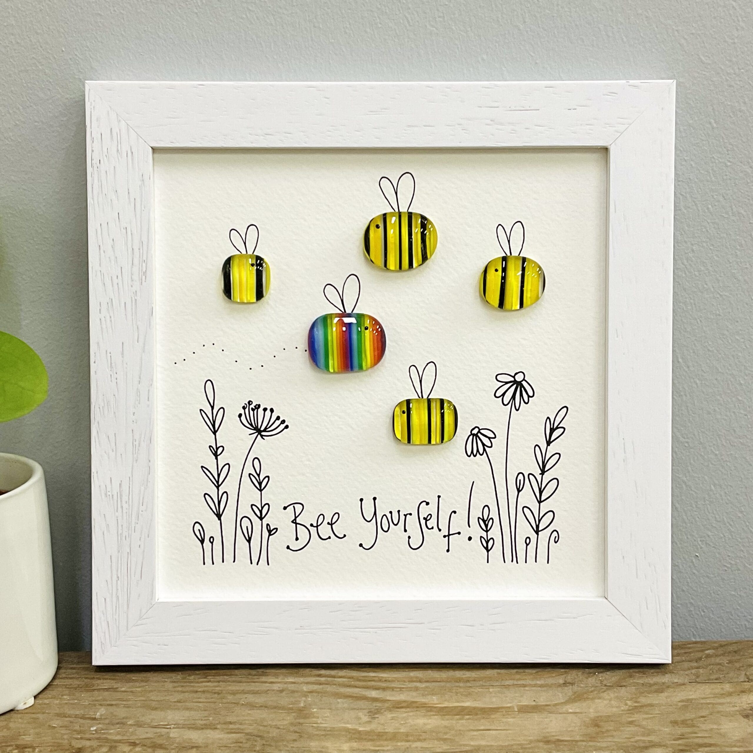 Fused glass Bee with ‘Bee yourself’ illustrated underneath.