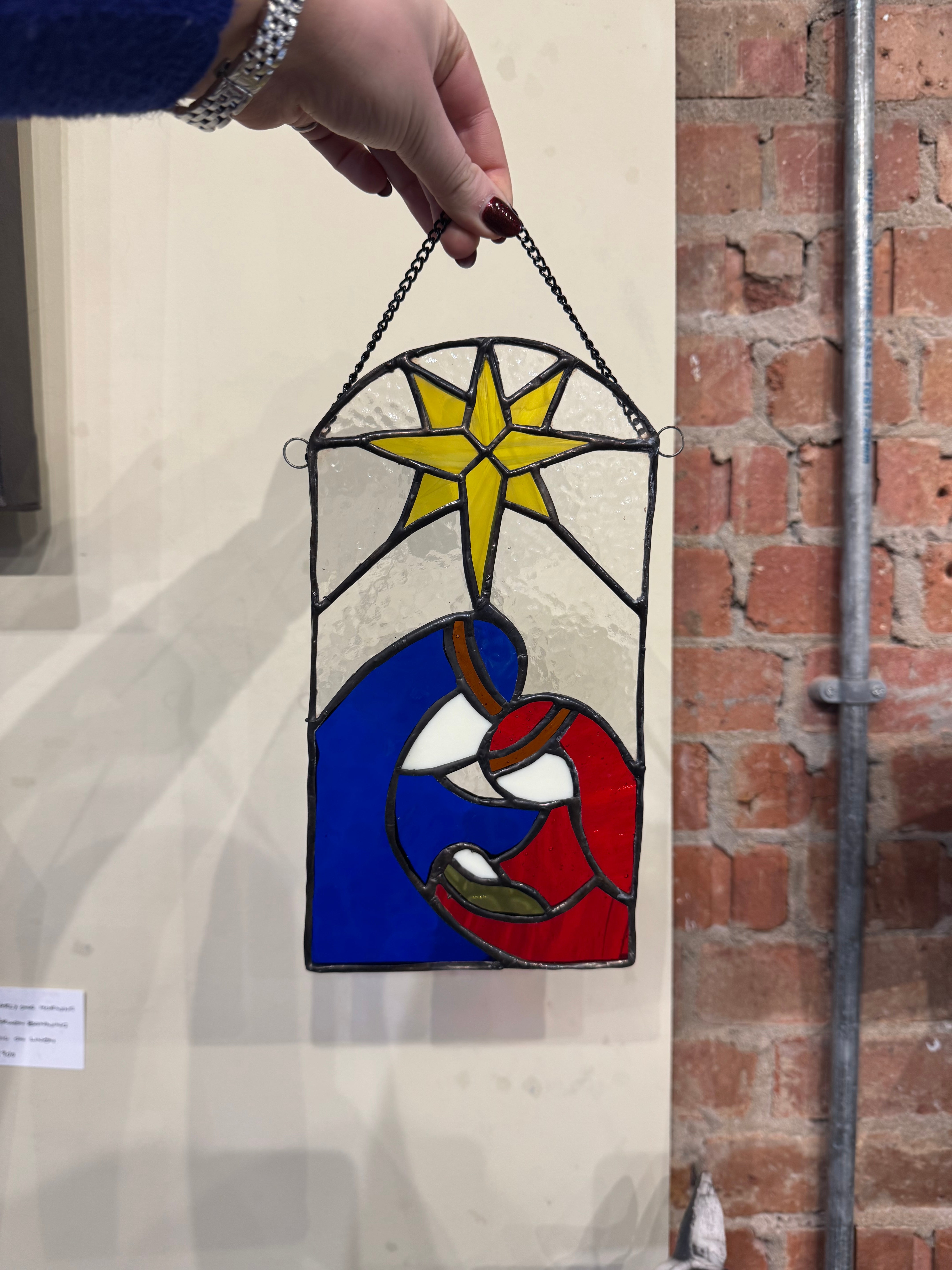 A Nativity scene of Jesus, Mary, and Joseph. Hanging Stained Glass, a light-catching original leaded and sealed hanging panel by a self-taught artist hailing from Waunarlwydd. This artist discovered her talents through crafting at her home studio! Complete with a chain for hanging.