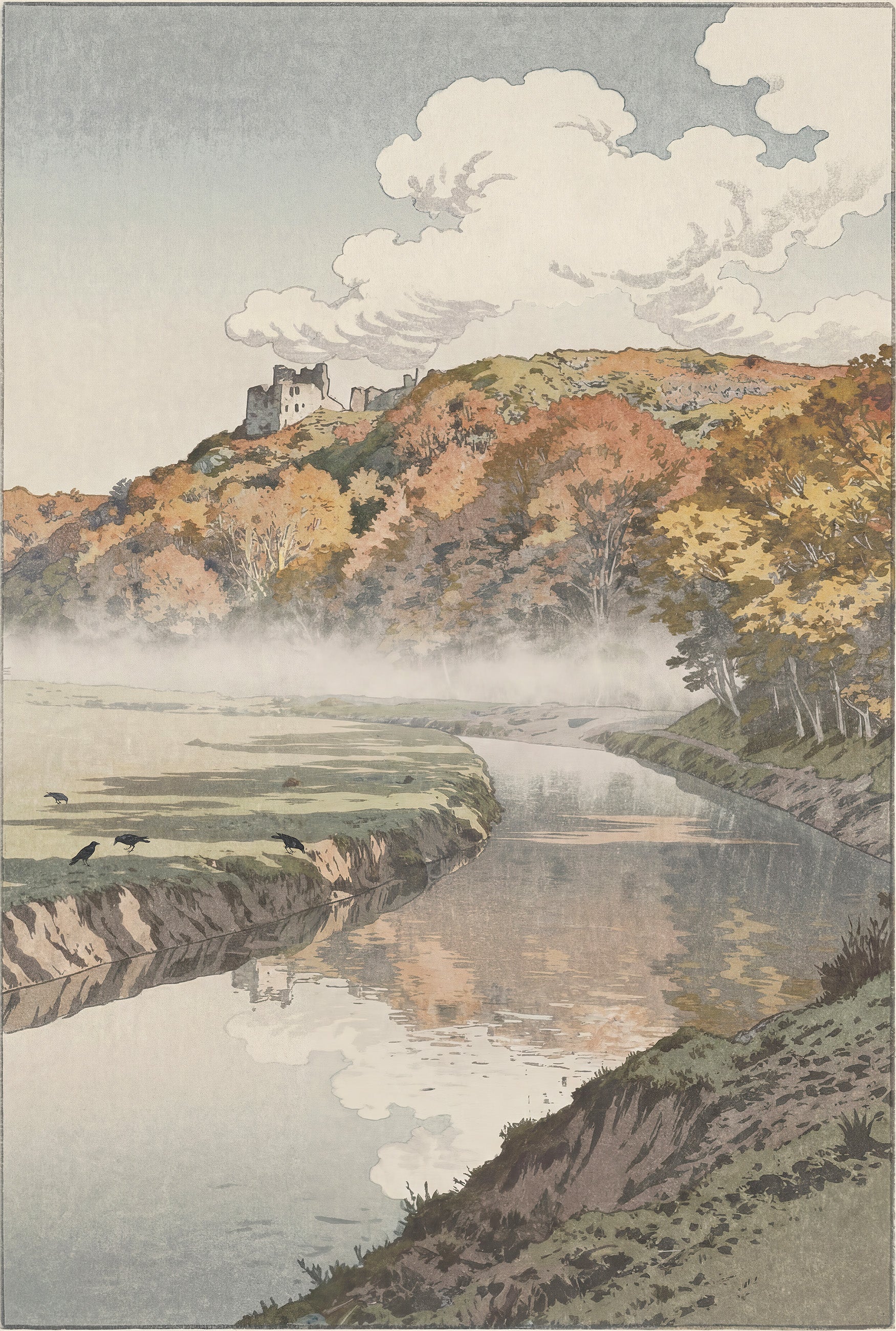 The composition of this work is built on a bold horizontal divide: the lower third given to the glassy, reflective tidal river, rendered in cool greys and muted umbers that read almost as negative space; the upper two-thirds claimed by the rising land, dense autumn canopy and the faint silhouette of Pennard Castle emerging from drifting mist. The mist is handled with a sequence of delicate bokashi gradient; the trees through overlapping planes of warm oranges, ochres and muted crimsons, each block with subtle overprinting and wood-grain texture – a nod to the sosaku-hanga interest in material presence. Birds on the cliff edge and the castle’s broken masonry are reduced to near-calligraphic black accents. The result is a landscape that feels both intimately observed and deliberately constructed – quiet, luminous, and with all the mystery of the Burrows intact.