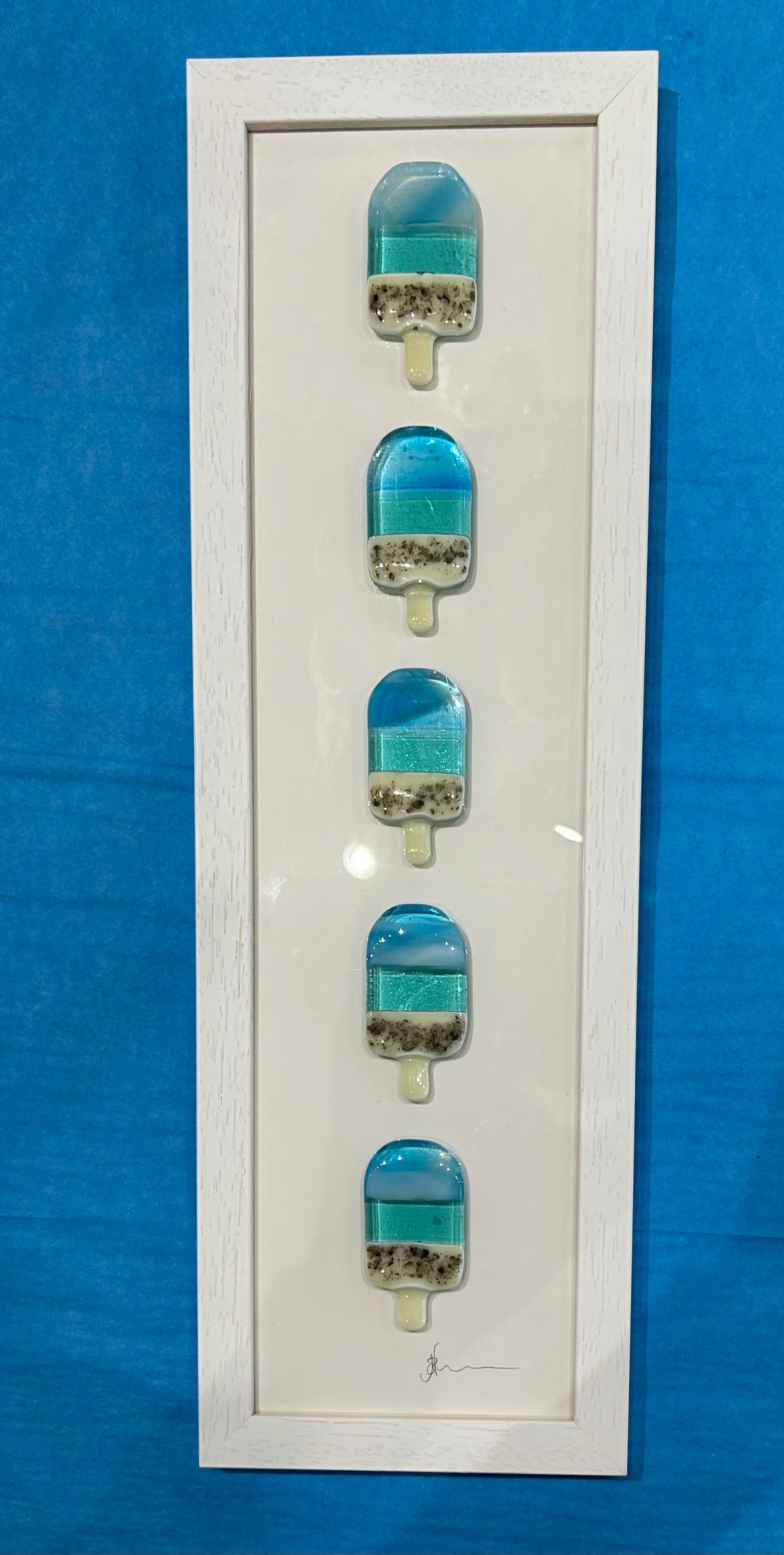 Beautiful lollies made from hand fused glass in a white frame.