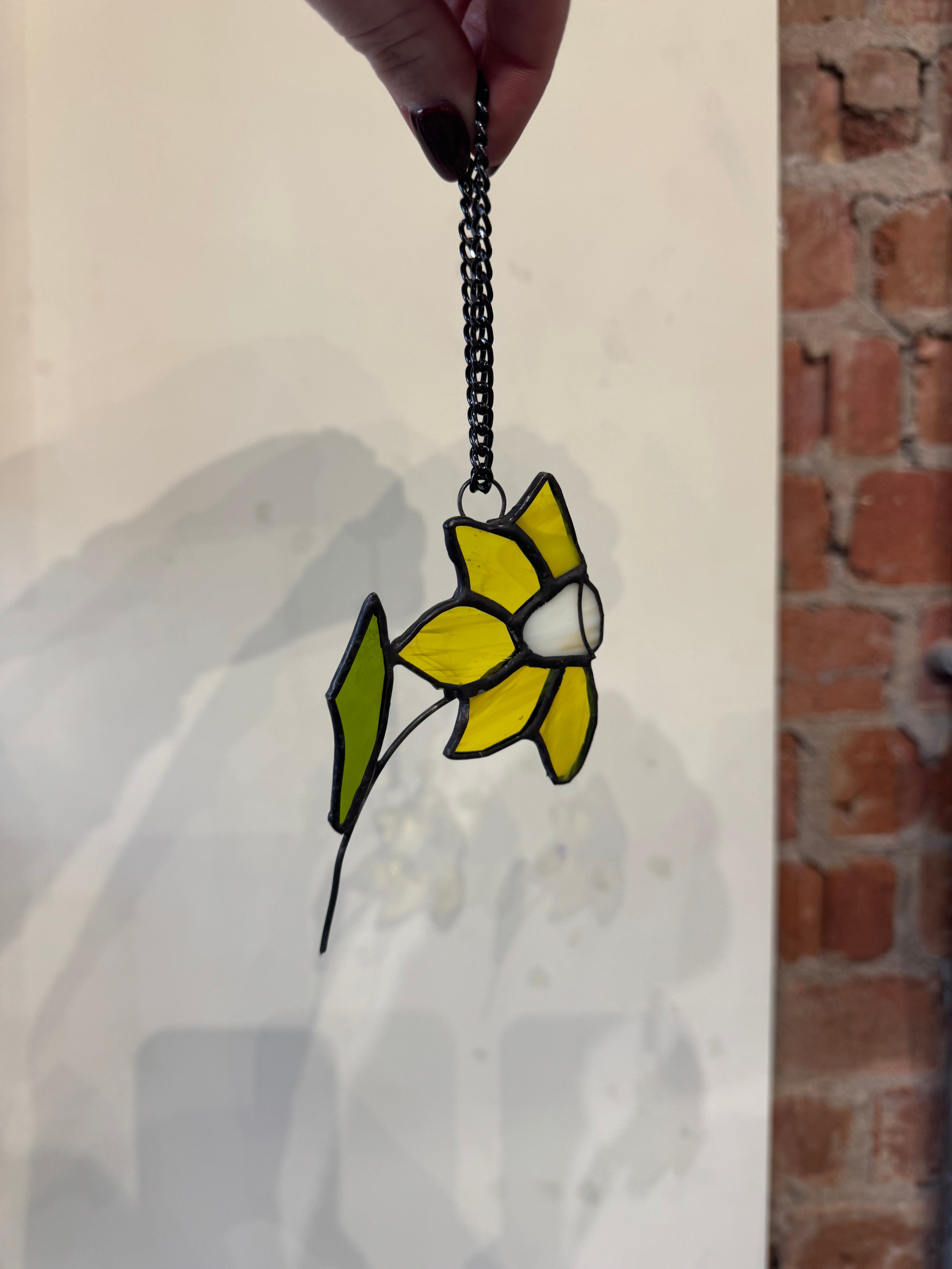 Daffodil Hanging Stained Glass, a light-catching original leaded and sealed hanging panel by a self-taught artist hailing from Waunarlwydd. This artist discovered her talents through crafting at her home studio! Complete with a chain for hanging.