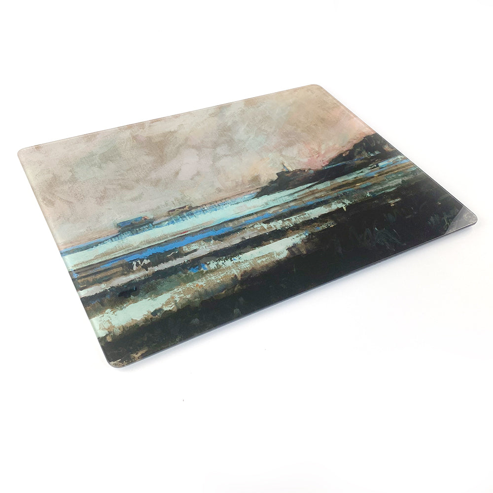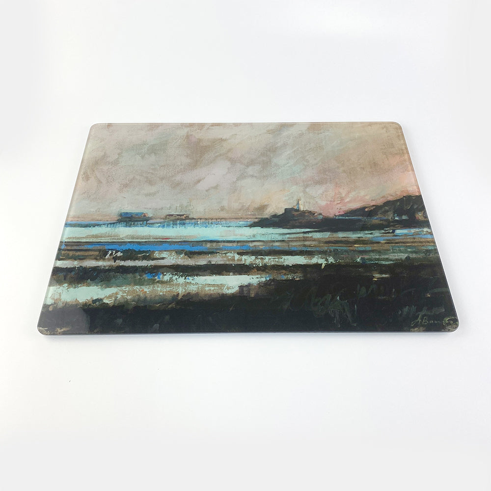 Glass chopping board decorated with the painting Milk Sea by Welsh artist Arwen Banning. The painting shows Mumbles Head as seen from the promenade, the pier, Mumbles lighthouse the pearlescent sea and the pale pink sky.